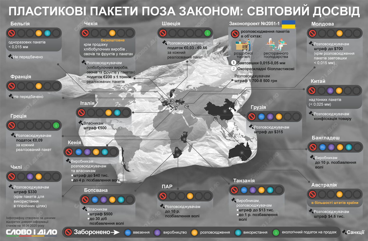 У листопаді 2019 року Верховна Рада України у першому читанні підтримала законопроект про обмеження обігу пластикових пакетів на території України. Йдеться про те, щоб із 2022 року заборонити продаж пакетів у супермаркетах та ресторанах, залишивши лише можливість використовувати таку упаковку для риби, м’яса та продуктів з них, а також сипких продуктів і льоду.