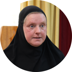 Наразі я є внутрішньо переміщеною особою, у 2018 році виїхала із окупованого села Многопілля, що поблизу Іловайська Донецької області. Мешкала там 20 років. Після повернення до західної частини України трохи побула у Зарваниці, а тепер живу із переселенцями з Донеччини, Луганщини та Харківщини у одному із гуртожитків міста Дрогобич. Вирішила не ховатися у стінах монастиря, бо коли людина не може прийти до церкви, то церква має прийти до людини. Працюю декоратором у Гімназії №5 імені Героя України Сергія Кульчицького, займаюся утилітарним мистецтвом.